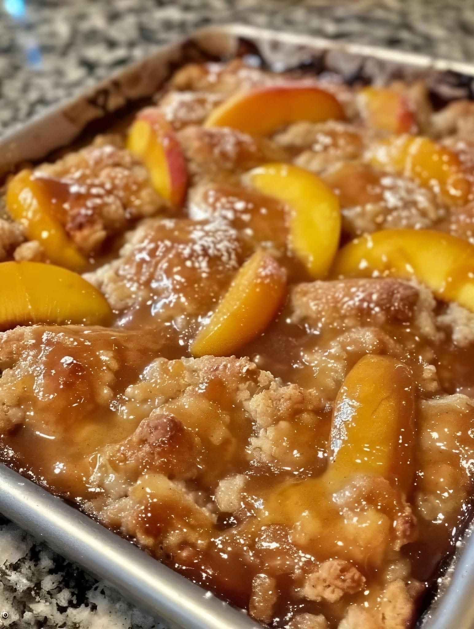 - Caramelization magic: As it bakes, sugars from the peaches and butter caramelize together, creating a syrupy glaze.