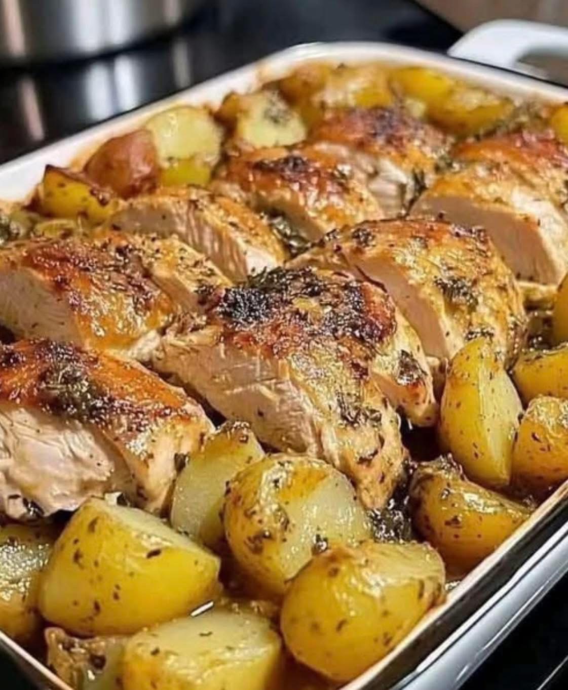 Juicy, golden chicken breasts roasted with tender baby potatoes in a buttery garlic-herb sauce—easy, comforting, and perfect for weeknights.