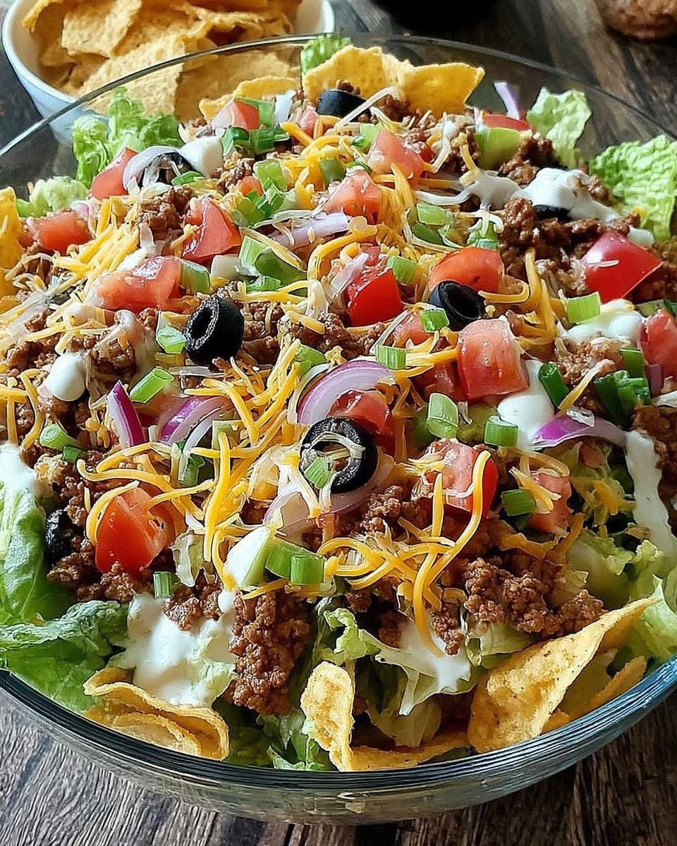 This Taco Salad is the perfect mix of crisp lettuce, seasoned ground beef, crunchy tortilla chips, juicy tomatoes, and a creamy drizzle on top. It’s fast, filling, and always a crowd-pleaser—great for weeknight dinners, parties, or game day.