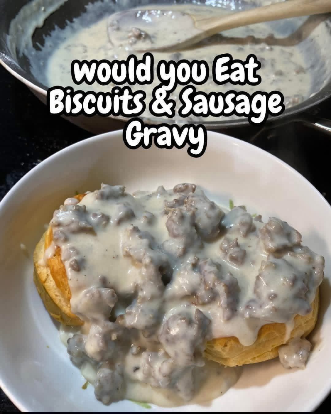 - Split warm biscuits and spoon hot sausage gravy over the top.