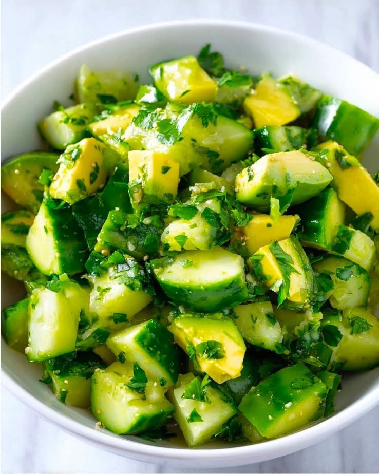 - Add cucumbers, avocados, parsley, and herbs to a bowl
