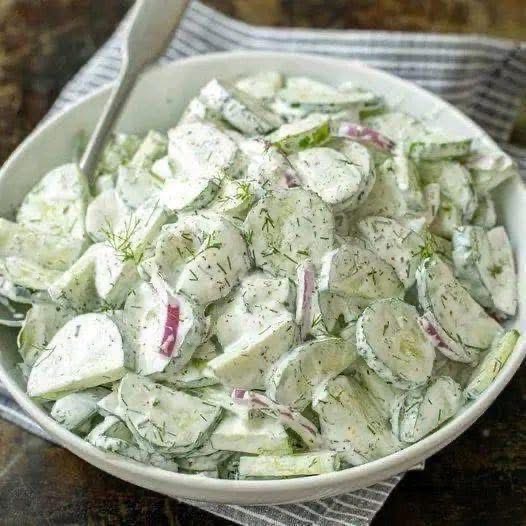 Toss cucumbers and onion with the dressing until evenly coated. - Chill & serve