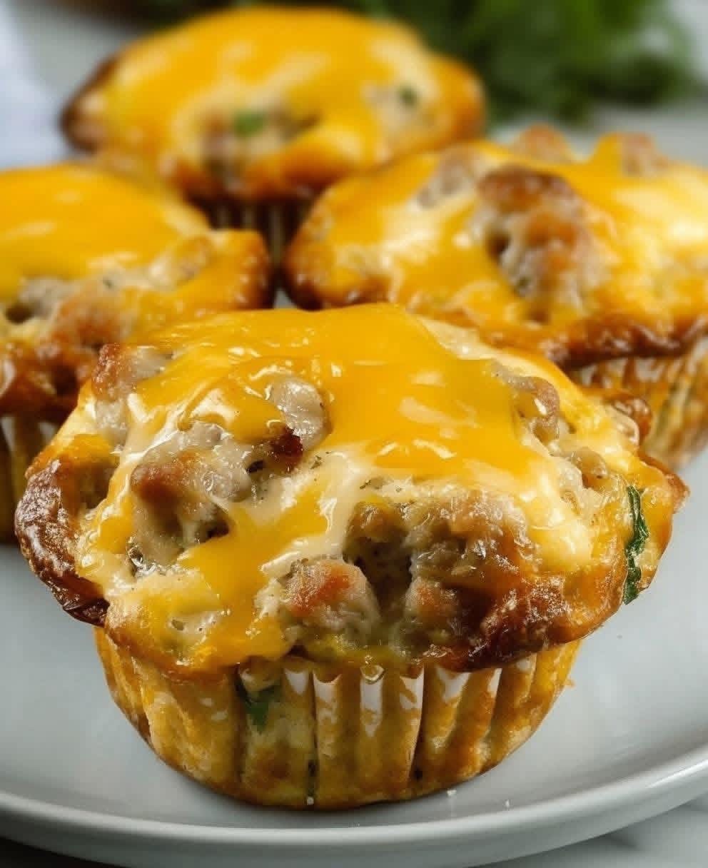 5. The Cheesy Finish: Top each muffin with a generous pinch of shredded cheddar cheese, just like the glossy tops in your picture.