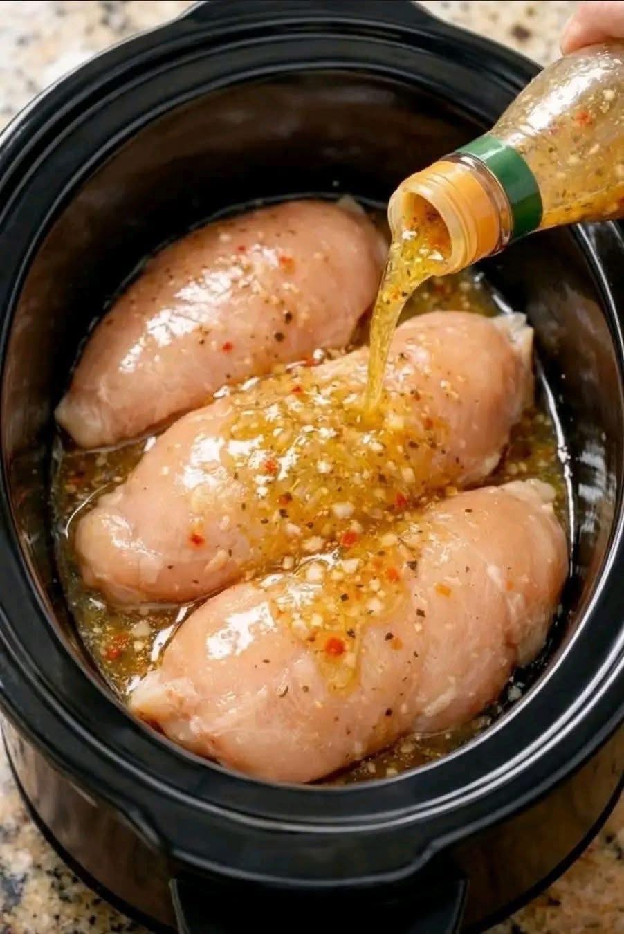 1. The Base: Place the chicken breasts in the bottom of your slow cooker, exactly like the professional setup in your picture.