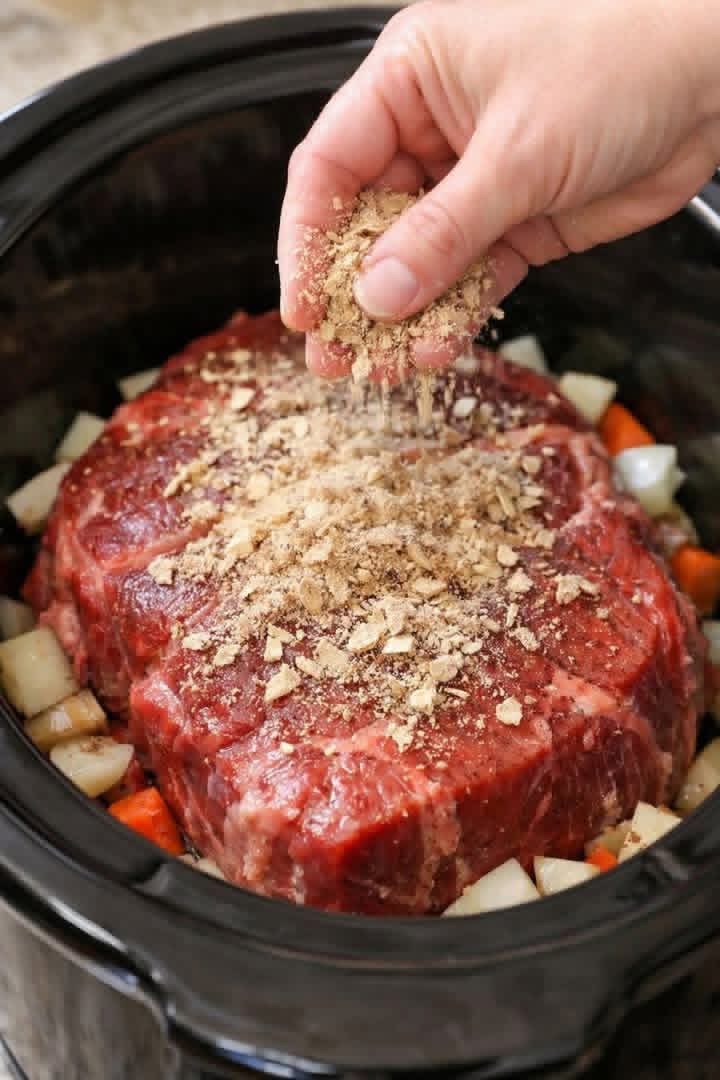 2. Season the Meat: Season the beef chuck roast with salt and black pepper on all sides. Place the roast on top of the vegetables.