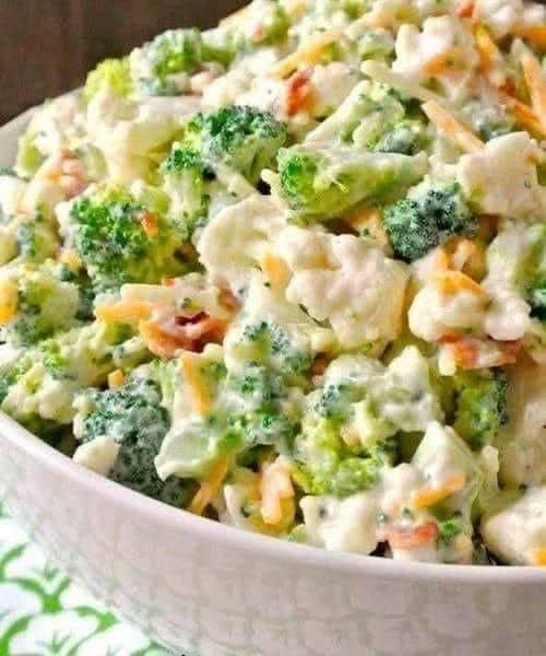 2. Combine: In a large bowl, toss the broccoli, cauliflower, shredded cheese, and red onion together.